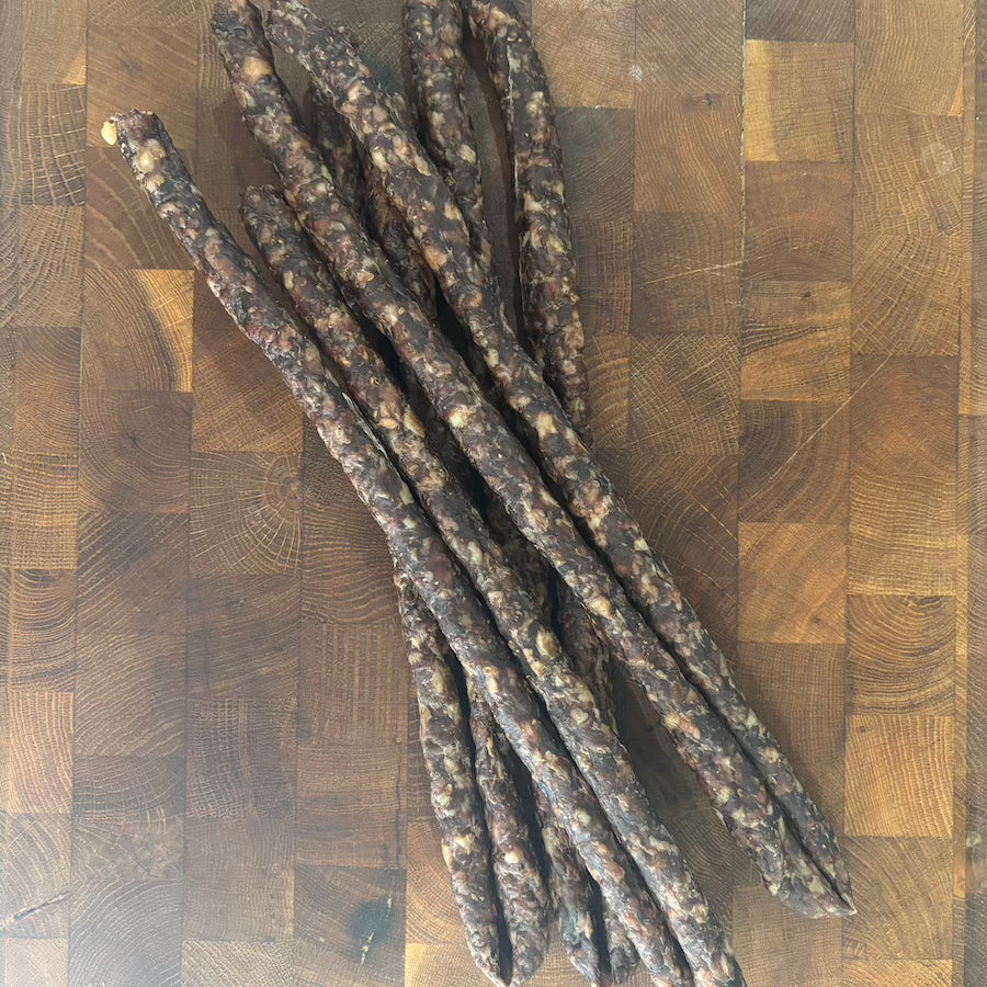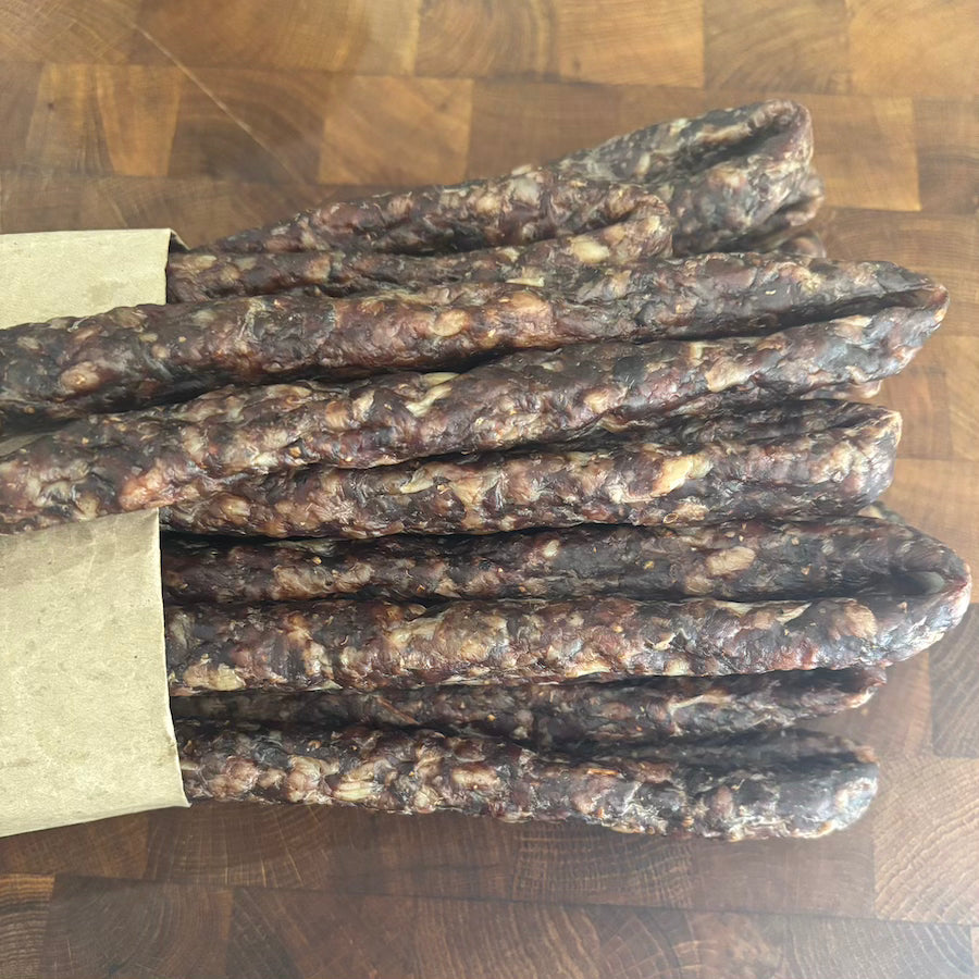 Our Homemade Grass-Fed Beef Drywors is crafted the traditional way, using only natural seasonings and free from MSG or preservatives. Made from 100% grass-fed beef, this flavourful, air-dried delicacy offers a perfect balance of savoury spices and rich beefiness. With its satisfying texture and wholesome ingredients, our drywors is a delicious, guilt-free treat you can enjoy anytime.